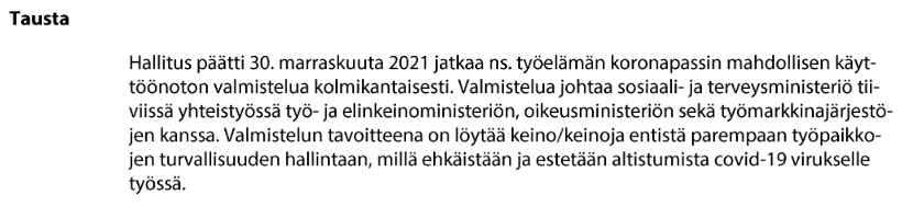1. arvioida edellytykset ja tarpeet ns. koronapassin laajentamiseen koskemaan työelämää;