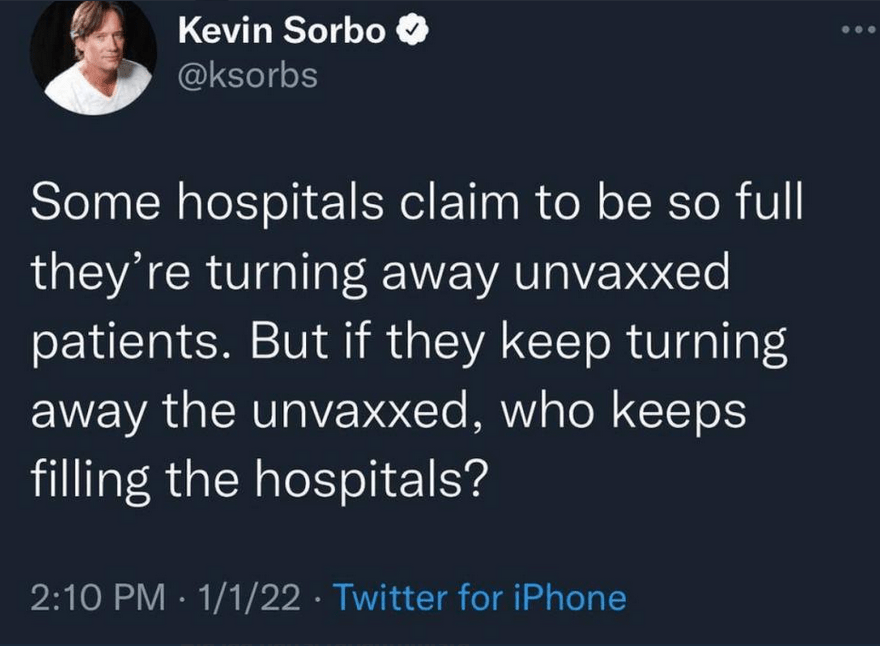 Herkules-ja Gene Roddenberry’s Andromeda -sarjoissa näytellyt Kevin Sorbo kommentoi Twitterissä joidenkin sairaaloiden esittämiä väitteitä, että ne ovat niin täynnä että rokottamattomia käännytetään pois.