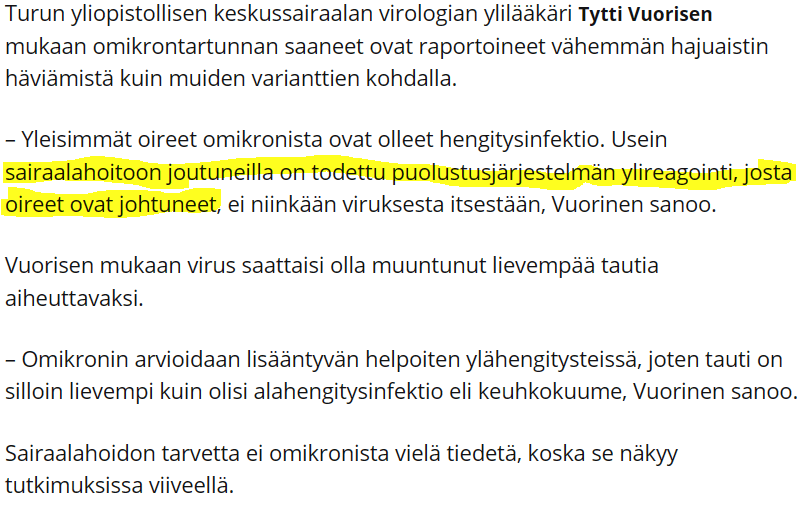 Yle uutisoi TYKSin virologian ylilääkäri Tytti Vuorisen sanovan sairaalahoitoon joutuneilla todetun puolustusjärjestelmän ylireagointia, josta oireet ovat johtuneet; sairaalaan vieneet oireet eivät ole johtuneet viruksesta.