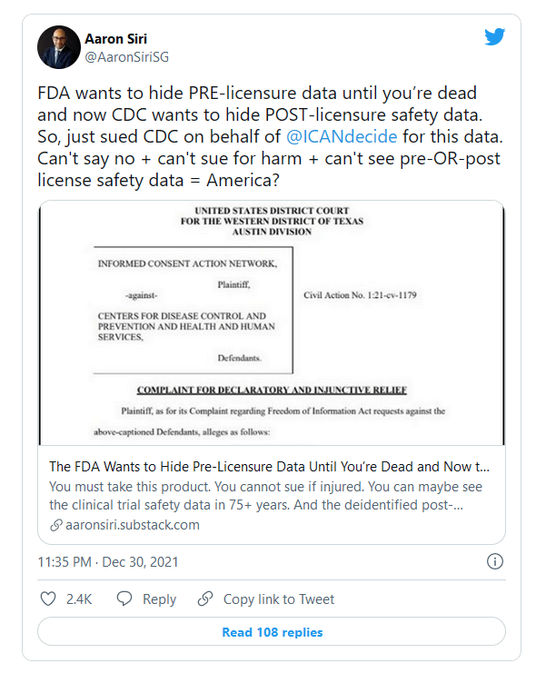 Kuvakaappaus Sirin tviitistä mainitsee myös Sirin ”Kansanterveyden ja lääketieteen ammattilaiset avoimuuden puolesta” -ryhmän (Public Health and Medical Professionals for Transparency, PHMPT) asianajajana jättämän, Yhdysvaltain lääketurvallisuusvirasto FDA:ta koskevan haasteen. FDA halusi salata Pfizer/BioNTechin koronapiikkejä koskevan turvallisuustiedon 55 vuodeksi. (Lue lisää: Lakimies: Pfizer tiesi k-piikin haittavaikutuksista)