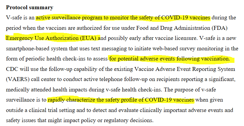 V-safe seuraa hätätilakäyttöluvan (EUA) myöntämisen jälkeen ilmeneviä koronarokotehaittoja, koska luvan myöntämistä edeltäneet kliiniset kokeet (jotka päättyvät vuonna 2023; Pfizer/BioNTech, Moderna) eivät ole riittävän laajoja, että harvinaisemmat haittavaikutukset nousisivat näkyviin.