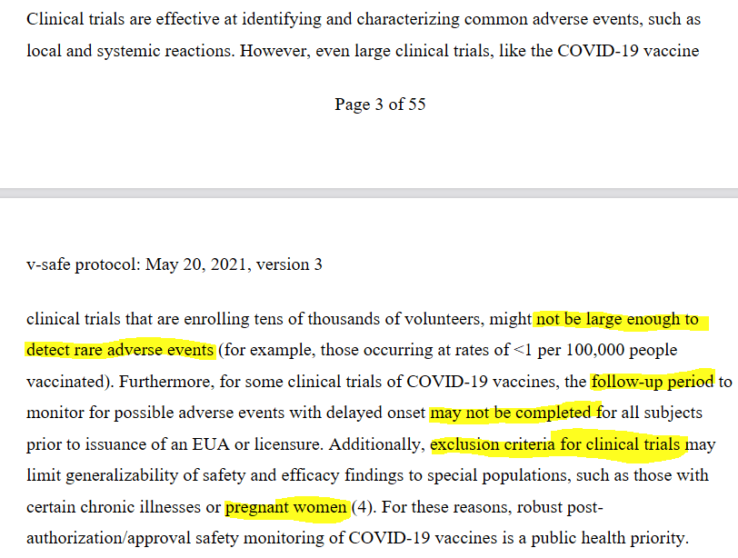 ”Joidenkin koronapiikkien kliinisten kokeiden kohdalla rokotusten jälkeistä turvallisuusseurantaa ei ehkä saada vietyä loppuun ennen EUA:n myöntämistä.” Lisäksi kliinisistä kokeista suljettiin ulos raskaana olevat naiset, kroonisesti sairaat ja monisairaat (kokeisiin osallistui vain terveitä).