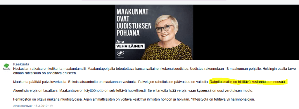 ”Sote-uudistuksessa siirretään veroeuroja puolueille jopa tuhansia euroja aluevaaliedustajaa kohden. Valtakunnallisesti summat ovat suurimmilla puolueilla miljoonia euroja. Nämä rahat otettaisiin maakuntaorganisaatioille osoitettavasta rahasta ja niillä valtuustoryhmät hankkisivat esimerkiksi toimitiloja, laitteita ja asiantuntijapalveluita. Keskustan, kokoomuksen ja SDP:n puoluesihteerit pitävät tukea perusteltuna,” kirjoittaa Terhi Kiemunki (ex-ps) Kansalainen-sivustolla.