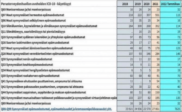 Yllä oleva THL:n Twitter-viesti tuli sen jälkeen, kun ikävästi tiedonhaluiset ihmiset olivat käyneet tutkimassa Avohilmon tilastointia (kuva alla), ja alkaneet esittää kysymyksiä merkittävistä nousuista tietyissä, ilmoitettuihin rokotehaittoihin maailmanlaajuisesti kytkeytyvissä kategorioissa. Esimerkiksi kasvu kategoriassa ”Synnynnäiset epämuodostumat, epämuotoisuudet ja kromosomipoikkeavuudet (Q00-Q99)” ei johdu koronasta tai koronapiikistä, THL sanoo, vaan ”teknisestä virheestä.” Edes kasvu koronarokotteiden haittavaikutuksissa ei johdu koronarokotteista.