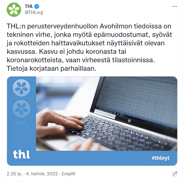 [https://www.facebook.com/thl.fi/posts/309391244552021?comment_id=309422841215528&reply_comment_id=309439184547227&__cft__[0]=AZWpeto42XIBKdRNS4zb_xNBEiir43IJzrqPOVVWtaHjts7GI3aR6q2RwHsPep_7DIKvDpQN5eQfHV-ULEiP_hwpBcrkvu-1vfhZoeWXml1ziJRzbR0tvr9DQsJ2mdkstnp8zQvmUMLOa-aYyl4odKTn&__tn__=R]-R]