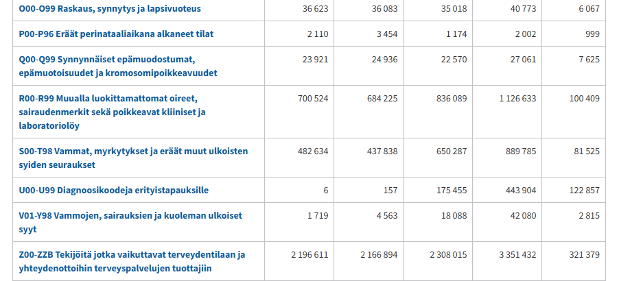Hei Anne, perusterveydenhuollon Avohilmo-rekisterissä ollut tekninen virhe on korjattu. Pahoittelemme virhettä. Voit tutustua korjattuihin aineistoihin verkkosivuillamme.