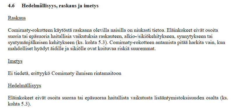 Yhdysvaltain VAERS-rokotehaittatietokantaan jätetyt ilmoitukset (esim. 927664, 939409, 954010, 1224688, 1254975, 1272428, 1343886, 1395088, 1415059, 1445743, 1031318, 1113464, 1182232 ) huomioiden THL:n väitteeseen siitä, että koronapiikkien kyseenalaiset sisällöt tai mRNA eivät kulkeutuisi äidistä lapseen, on syytä suhtautua hyvin, hyvin varovaisesti.