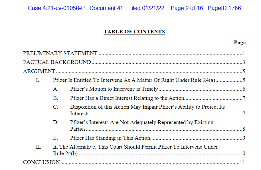 FDA haastettiin Pfizerin koronapiikkien turvallisuustietojen salaamisesta oikeuteen syyskuussa 2021. Haasteen seurauksena FDA pyysi tuomarilta lupaa salata tiedot ensin 55 vuodeksi ja sitten 75 vuodeksi. Tuomari kuitenkin määräsi FDAn toimittamaan pyydetyt turvallisuustiedot 55 000 sivua kerrallaan 30 vuorokauden välein. Sen jälkeen Pfizer on pyytänyt päästä mukaan editoimaan luovutettavaksi määrättyjä tietoja. Hallituksen antaman lausunnon mukaan FDA pitää Pfizerin apua tarpeellisena. Kantaja on pyytänyt tuomaria hylkäämään Pfizerin pyynnön.