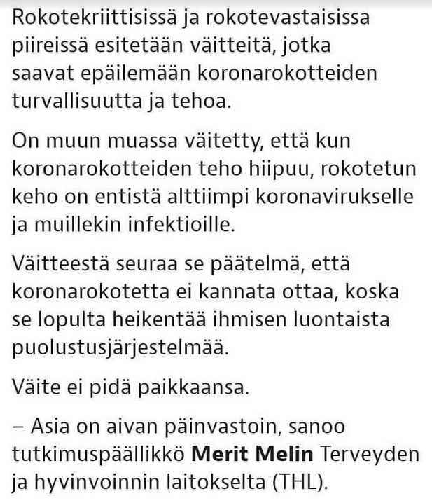 Terveyden ja hyvinvoinninlaitos THL, tuo luotettavaa tietoa tarjoava kansallinen asiantuntijalaitos, joka on pitänyt huolta suomalaisten hyvinvoinnista ja terveydestä ajantasaisten, luotettavien ja täsmällisten tietojen avulla vuodesta 2009, on varoittanut suomalaisia rokotekriitikkojen vääristä väittämistä.