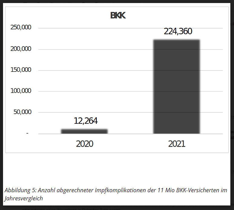 Kuitenkin yritysten sairausvakuutuskassojen kattojärjestö BKK:n (Betriebskrankenkassen) tiedossa on – 7,5 kuukauden ajalta vuonna 2021 – jo 224 360 lääkärin laskuttamaa hoitokäyntiä, jossa lääkäri on hoitanut potilasta rokottamisen jälkeen ja kirjoittanut *diagnoosin* rokotehaitasta. Nämä tiedot koskevat luonnollisesti vain BKK:n lähes 11 miljoonaa jäsentä. [1]